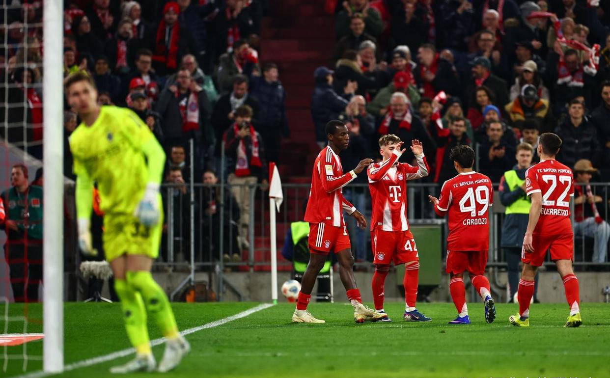 易边再战,第54分钟,穆西亚拉在前场送出助攻,雅克松虽然射门被扑挡出,但随后门兴赖茨犯规将雅克松放倒,裁判判罚点球并直接出示红牌驱逐赖茨。穆西亚拉冷静主罚命中,将比分改写为3-0,奠定了胜局。随后的第78分钟,卡尔右路突破传中,雅克松门前包抄轻松破门,拜仁将领先优势扩大到4球。尽管第88分钟门兴通过穆赫亚补射打入一球挽回颜面,最终拜仁主场仍以4-1赢得一场酣畅淋漓的胜利。